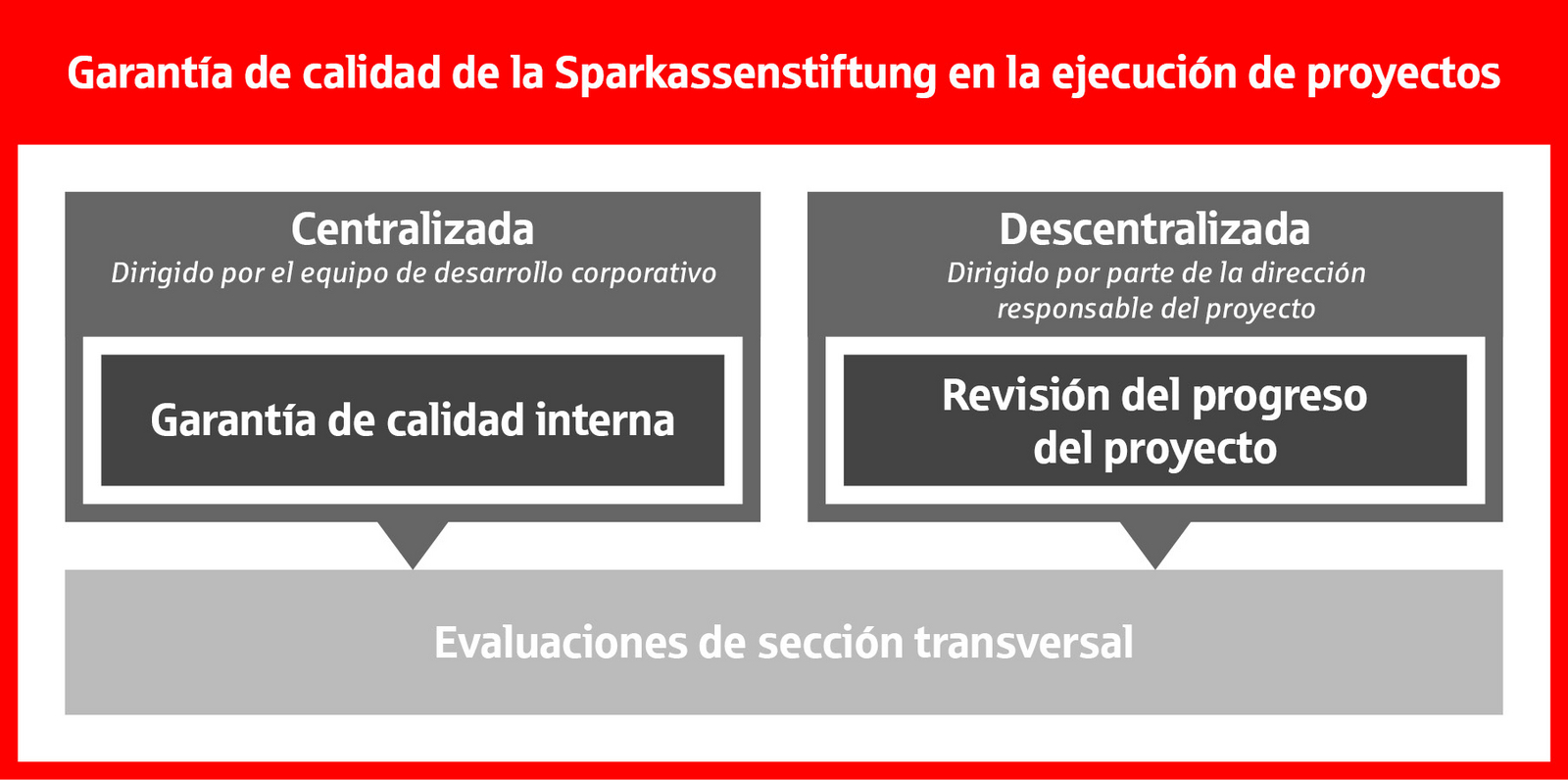 El objetivo de la Central de Garantía de Calidad es generar valor agregado para la Sparkassenstiftung Alemana en su conjunto mediante el intercambio de conocimientos / mejores prácticas dentro de los proyectos, pero también mediante el esclarecimiento y, en caso necesario, la mejora de los procesos. Para ello, en diciembre de cada año se seleccionan al azar tres proyectos en curso. En estos tres proyectos se realiza un examen interno de calidad sobre el terreno, durante el cual se examinan e iluminan los siguientes temas en cuanto a su contenido: 1) gestión y procesos del proyecto, 2) comunicación y 3) otras características especiales que puedan transferirse a otros proyectos si es necesario. Sobre la base de un informe con recomendaciones para la acción, se elabora un plan de actividades para la Sparkassenstiftung Alemana con medidas, responsabilidades y plazos para la aplicación de medidas de garantía y mejora de la calidad.