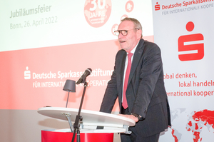 Heinrich Haasis, langjähriger Vorstandsvorsitzender der Deutschen Sparkassenstiftung, würdigte in seiner Ansprache die Arbeit aller rund 400 Mitarbeiterinnen und Mitarbeiter weltweit. Gleichzeitig verdeutlichte er den seit 30 Jahren geltenden, integralen Zusammenhang zwischen der Arbeit der deutschen Sparkassen und dem Engagement der Deutschen Sparkassenstiftung im Ausland: „Der Grundgedanke war und ist einfach: Zu unserem Öffentlichen Auftrag gehört auch die Verantwortung für die Ärmsten der Welt. Wir bieten Hilfe zur Selbsthilfe und machen unsere Erfahrungen, unser Wissen verfügbar für unsere Partner in aller Welt.“