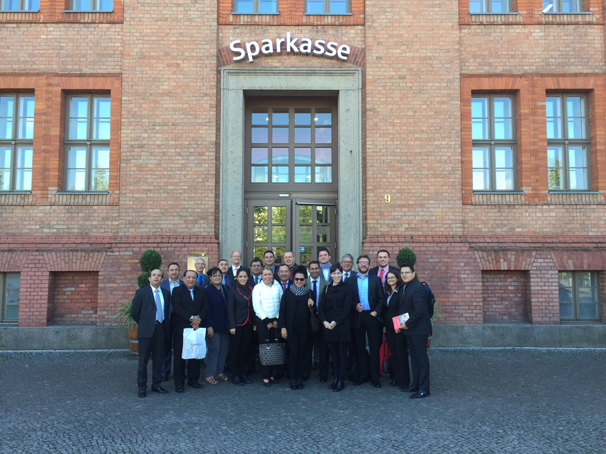 Die erste Station der Reise war der Deutsche Sparkassen- und Giroverband (DSGV) in Berlin. Hier begrüßte Dr. Karl-Peter Schackmann-Fallis, Geschäftsführendes Vorstandsmitglied des DSGV, die Gäste, bevor Dr. Thomas Keidel, Direktor Financial Market Relations, in einem Einführungsvortrag über die Sparkassen-Finanzgruppe und die Rolle der Sparkassen in Deutschland informierte. Anschließend stellten die Projektreferenten Inka Rank und Gerd Weißbach die Arbeit der Sparkassenstiftung für internationale Kooperation vor.