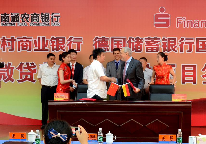 Am 25. Juni 2015 unterzeichneten der Vorstandsvorsitzende der Nantong Rural Commercial Bank, SHE Jun, und der stellvertretende Geschäftsführer der Sparkassenstiftung, Ferdinand Feldgen, eine Projektvereinbarung zum Aufbau des Kreditgeschäfts für kleine Unternehmen der Nantong Rural Commercial Bank.