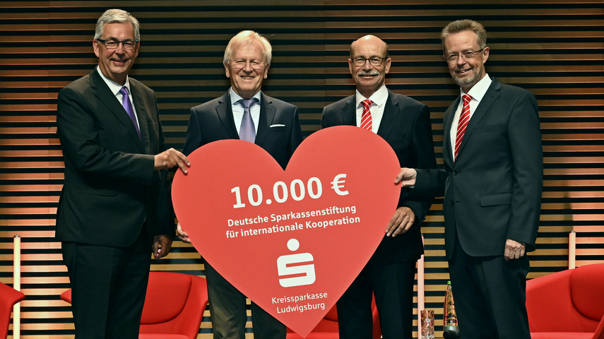 Heinrich Haasis, Vorstandsvorsitzender der Deutschen Sparkassenstiftung für internationale Kooperation, der bei der Veranstaltung Ehrengast war, freute sich sichtlich über diese großzügige Spende. Mit diesem Beitrag könne die Deutsche Sparkassenstiftung einen Beitrag zur finanziellen Inklusion von Menschen in derzeit rund 50 Entwicklungs- und Schwellenländern leisten.