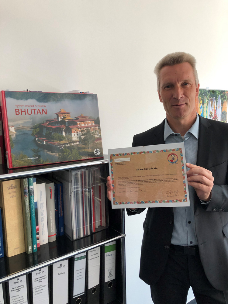 Carsten Steffan, Geschäftsführer des DSGV ö.K. und des SIDT hält das Shareholder Zertifikat aus Bhutan in den Händen.