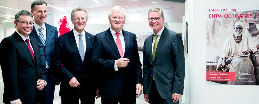 Heinrich Haasis, Präsident des Weltinstituts der Sparkassen und Franz Scholz, Vorstandsvorsitzender der Kreissparkasse Esslingen-Nürtingen, eröffneten die Ausstellung am 30. Oktober gemeinsam mit den beiden Vorstandsmitgliedern Burkhard Wittmacher und Frank Dierolf sowie mit Landrat Heinz Einiger feierlich im Esslinger Kreissparkassenhaus.